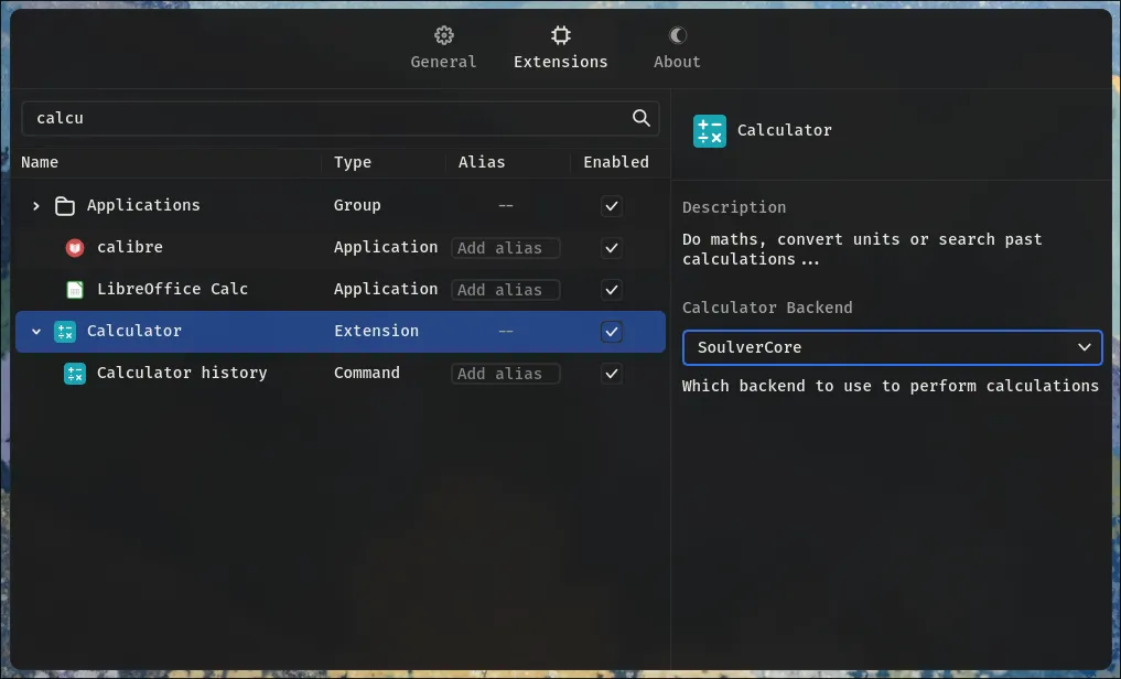 Unlike most other backends, support for SoulverCore is not something that can be enabled at build time. Instead, Vicinae will try to load up a specific shared library on startup and, on success, add the SoulverCore backend to the list of available ones.